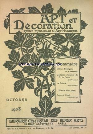 ART ET DECORATION [No 10] du 01/10/1908 - VITRAUX ETRANGER PAR VERNEUIL - QUELQUES MEUBLES DE G. DE FEURE PAR LARAN - LA POTERIE PAR DU CHASNET - CARTON DE VITRAIL PRA FARMAKOWSKI Info
