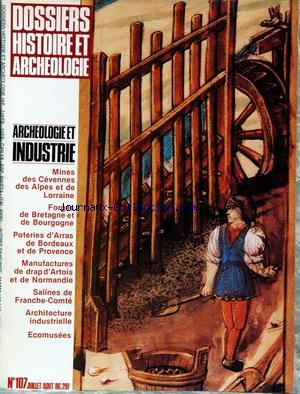 DOSSIERS HISTOIRE ET ARCHEOLOGIE [No 107] du 01/07/1986 - ARCHEOLOGIE ET INDUSTRIE - MINES DES CEVENNES - DES ALPES ET DE LORRAINE - FORGES DE BRETAGNE ET DE BOURGOGNE - POTERIES DE ARRAS - BORDEAUX DE DE PROVENCE - MANUFACTURES DE DRAP D'ARTOIS ET DE NORMANDIE - SALINES DE FRANCHE-COMTE - ARCHITECTURE INDUSTRIELLE - ECOMUSEES. Info